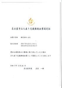 HOME > お知らせ > 新着情報 > 名古屋市立ち直り支援推進企業認定証